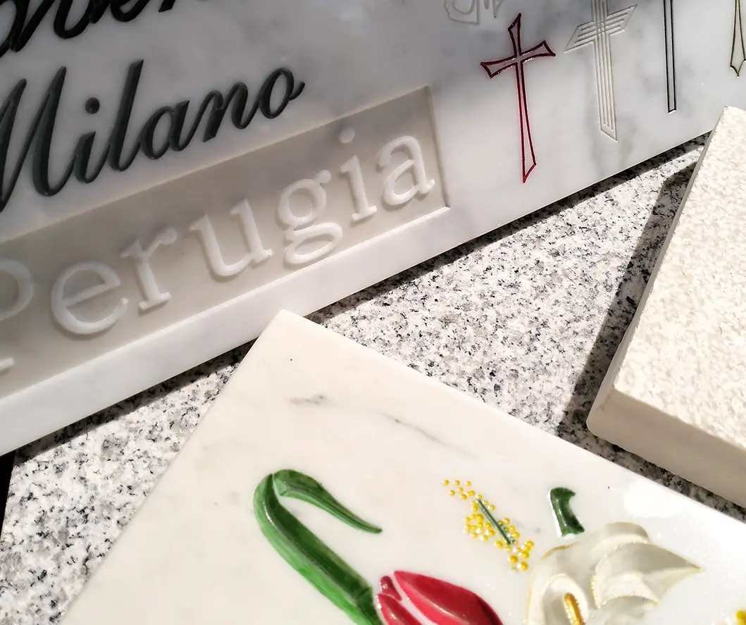 Potrete scegliere, supportati dal nostro personale e dalla collaborazione con artigiani specializzati nella lavorazione del marmo, tra diverse tipologie di design e materiali, personalizzando le finiture , gli accessori da applicare e lo stile dei caratteri incisi o applicati sulla lapide.